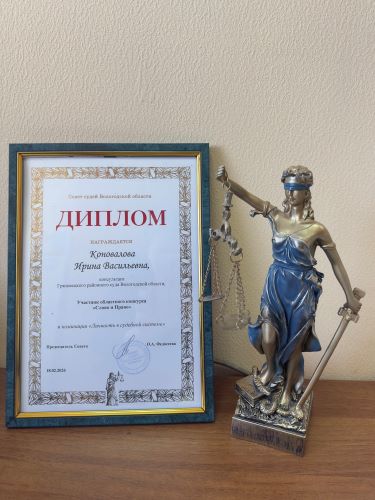Консультант суда награждена дипломом за участие в конкурсе «Слово и право» Консультант Грязовецкого районного суда Вологодской области Ирина Коновалова награждена дипломом за участие в областном конкурсе «Слово и Право», который проводил Совет судей Вологодской области. Ирина представила свою работу в номинации «Личность в судебной системе» - интервью с судьей в отставке Людмилой Юрьевной Соколовой «Покой нам только снится», опубликованное в газете Грязовецкого муниципального округа «Сельская правда». «Благодарю за возможность участия в таких нужных профессиональных конкурсах, потому как это уникальный шанс проявить свои способности и вдохновиться на новые достижения», - отмечает Ирина. ![]() |